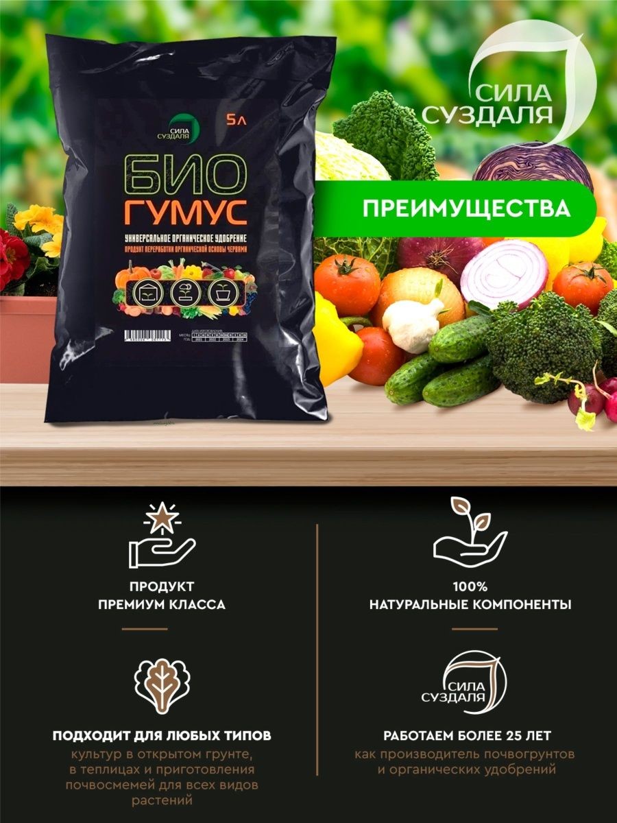 Биогумус (вермикомпост) содержит исключительно естественные и полезные компоненты. В отличие от навоза, он более эффективный и безопасный, а самое главное, у биогумуса отсутствует неприятный запах.